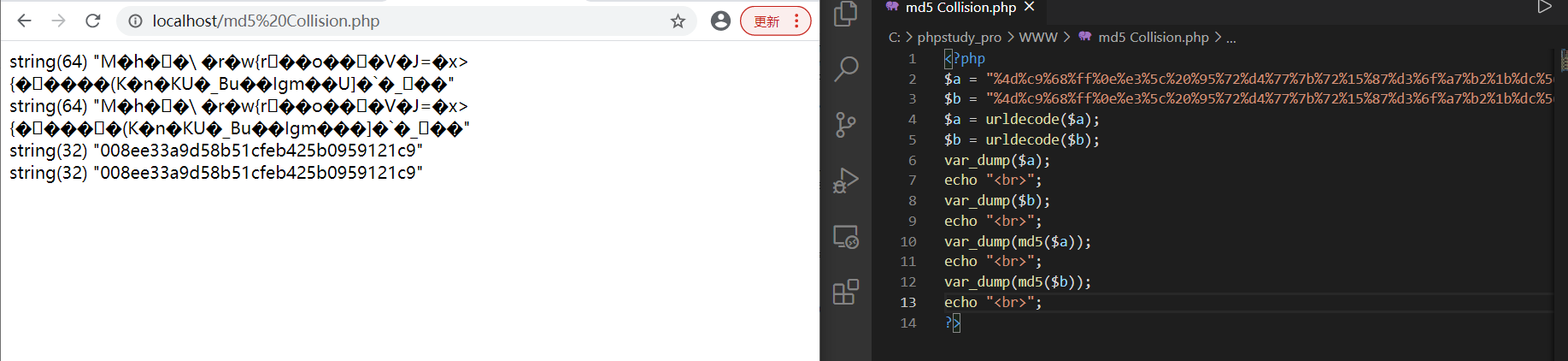 a与b在url解码后进行md5加密得到相同的结果,如下图所示: