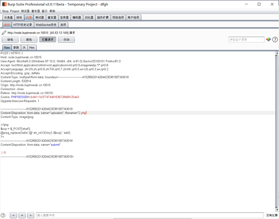 用burpSuite抓包更改文件后缀从jpg改成php绕过检测