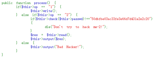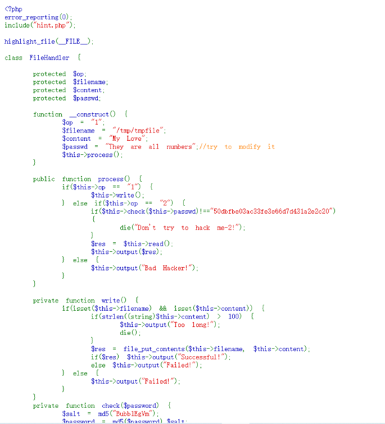 通过get方法传入已经序列化的参数,当参数为常规可反序列化对象时进行反序列化,传入protected类型变量op,filename,content和passwd,其中passwd值需要经过验证,在传入pop参数后在析构函数中调用process函数进行反序列化以及验证passwd操作