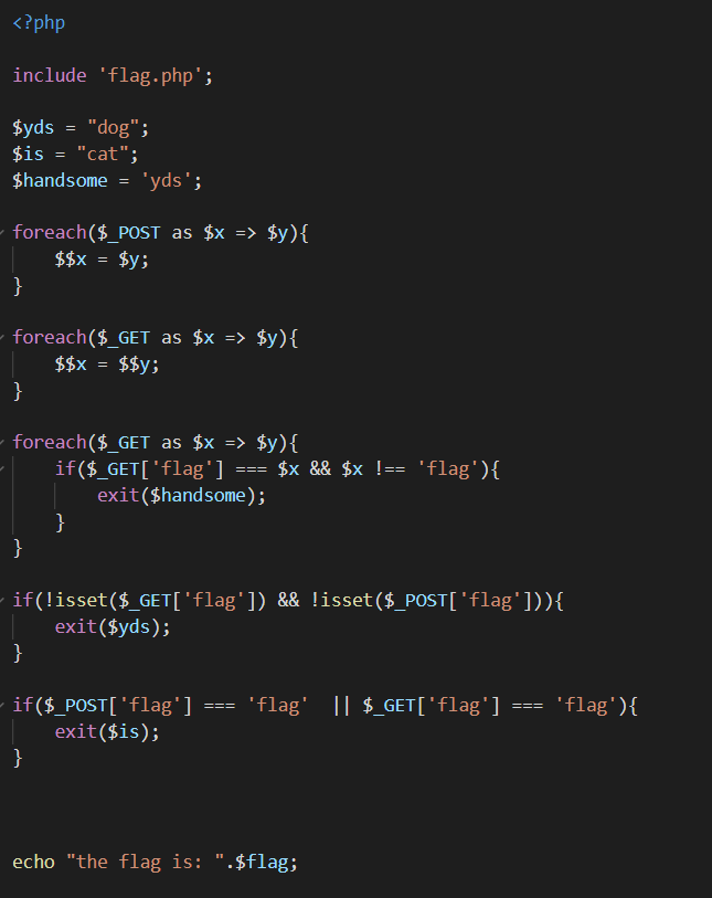 通过分析语义得知,首先输入要以a=b的形式输入,将$x与$y分别赋值为a和b,并且采用GET方式的情况下有$($a)=$($b),采用POST方式的情况下有$($a)=$b。而后逐个判断:若输入flag并且flag===x并且x!==’flag’的时候输出handsome退出,并非所求解。若未传入flag则输出yds,若传入flag并且flag=’flag’则输出is,因而最终有如下两种思路